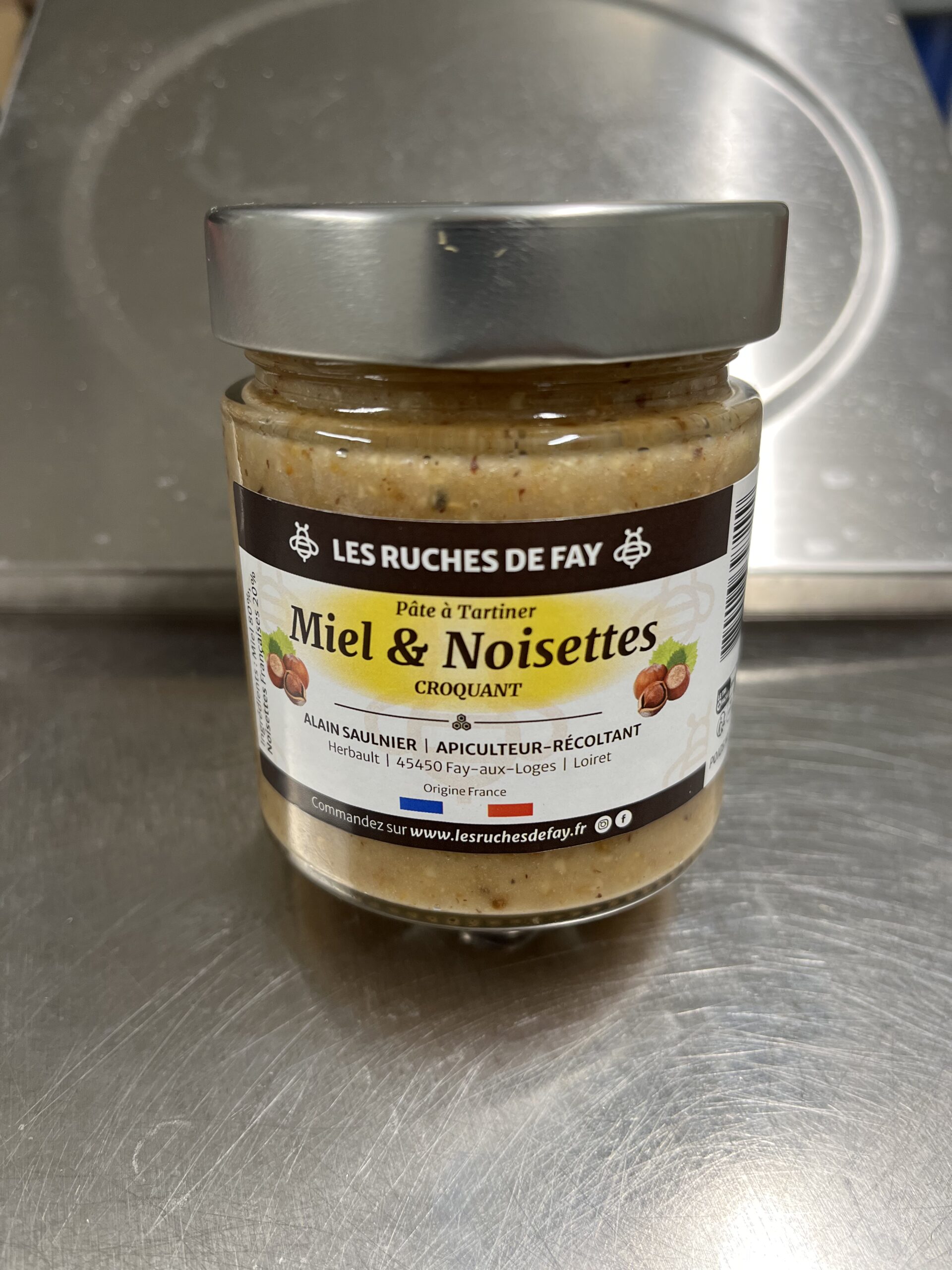 Subtil mélange de Miel du Loiret (80%) avec de la noisette française torréfiée et broyée (20%)